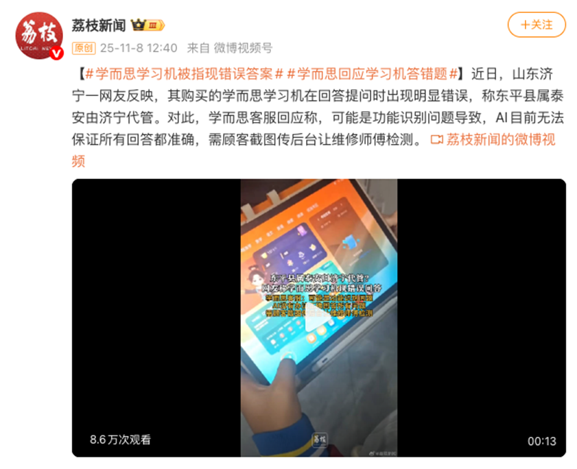 2025年11月8日,《荔枝新闻》报道称,山东济宁一网友发现,自己购买的学而思学习机回答提问时给出了错误答案。