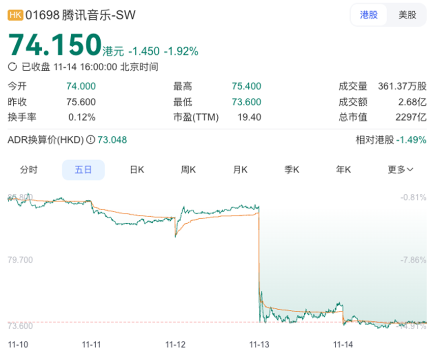 然而,交出亮眼业绩答卷后,腾讯音乐的股价却上演高台跳水。11月13日,腾讯音乐港股股价报收75.6港元/股,单日下跌10.69%。事实上,将时间拉长来看,2025年9月以来,腾讯音乐的股价持续走低,累计跌幅已接近30%。