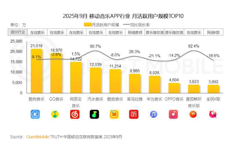 QuestMobile披露的《2025中国移动互联网秋季大报告》显示,2025年9月,腾讯音乐旗下音乐App月活均同比下跌。其中酷狗音乐月活2.1亿,同比下跌8.1%、QQ音乐月活1.9亿,同比下跌2.8%、酷我音乐月活1.13亿,同比下跌8%、全民K歌月活3692万,同比骤降16.6%。