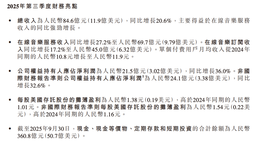 2025年11月12日港股盘后,腾讯音乐披露2025年Q3财报,营收84.6亿元,同比增长20.6%;净利润24.8亿元,同比增长27.7%。