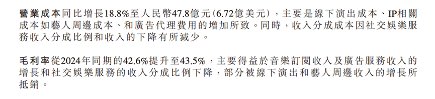 更重要的是,尽管现阶段,腾讯音乐的用户规模不及Spotify,但前者的利润空间已超越后者。财报显示,2025年Q3,腾讯音乐毛利率为43.5%,比Spotify高11.9个百分;经营利润率达32.03%,比Spotify高18.43个百分点。