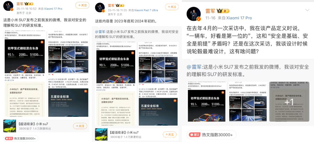 随后,雷军又两次转发了上述微博,其中一条配文,“这些内容是2023年底和2024年初的。”证实自己在产品研发之时,已经将安全作为产品研发的基础。