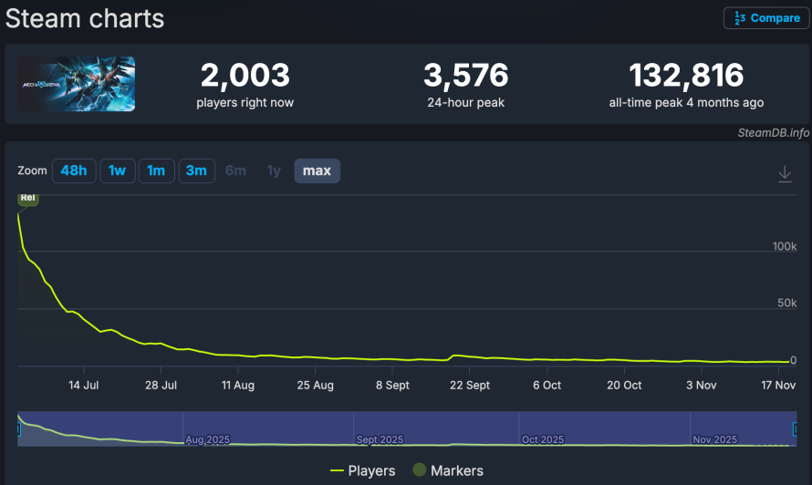 另据steamdb数据,《解限机》的日常在线人数已由开服的超13万人锐减至千人级别。