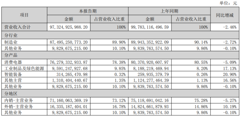 从2024年年报开始,格力电器调整统计口径,主要将原“空调”与“生活电器”两大板块合并为“消费电器”。2025年上半年,格力电器消费电器实现营收762.79亿元,同比减少5%,总营收占比仍旧高达78.38%。