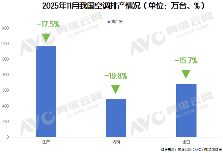 此外,随着“国补”进入到尾声阶段,国内家电行业仍旧受制于房地产低迷、国内消费疲软等宏观因素。根据奥维云网推总数据显示,9月空调零售量同比下滑21.2%,市场失速严重。生产端来看,11月空调内销排产488.5万台,同比下滑19.8%;出口排产683.7万台,同比下滑15.7%,已连续两个月大幅下滑。