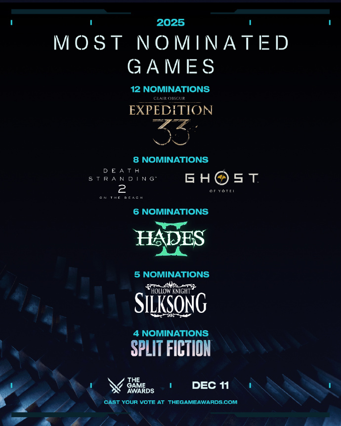 【6】11月18日凌晨1点,TGA(The Game Awards)公布了今年各奖项的入围名单。《光与影:33号远征队》也打破了历年的TGA提名纪录,共获12项提名。这一数字刷新了TGA历史上单部作品的提名总数,超越了此前由《战神:诸神黄昏》保持的10项纪录。库洛的《鸣潮》再次提名TGA最佳手游,沐瞳的《Mobile Legends: Bang Bang》也继2024年提名最佳电竞游戏,再次出现在TGA的舞台上。