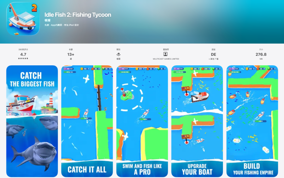 事实上早在2020年,《Fish Idle 2》开发商MulticastGames确实在海外移动市场推出过一款名为《Idle Fish 2: Fishing Tycoon》的手游,并获评2021年最佳放置钓鱼游戏。但风光过后,其下载数一路下滑,此番在Steam崭露头角,可谓二次翻红。