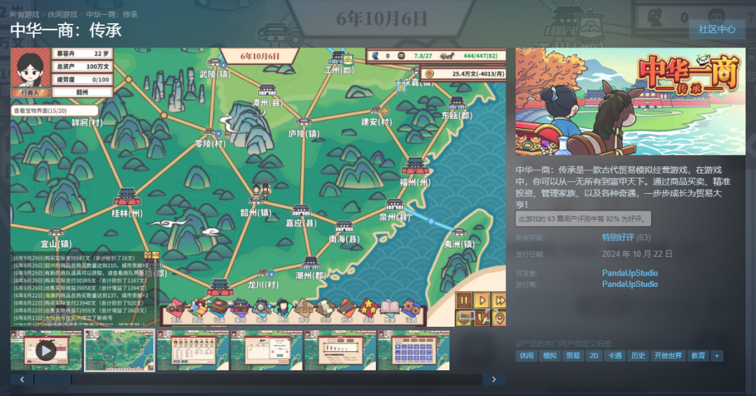 买断制PC游戏《中华一商》制作人「托举的熊猫」也曾在开发日志中透露,最初他并未打算开发PC版,因为“我并没有要上架Steam的勇气,毕竟PC平台和手机平台还是存在着很多不一样的地方”。后来,发行商BD Games注意到了这款游戏,问要不要上Steam,这才有了以PC版面世的《中华一商》(该作Steam评论超400,目测销量应有几万份)。