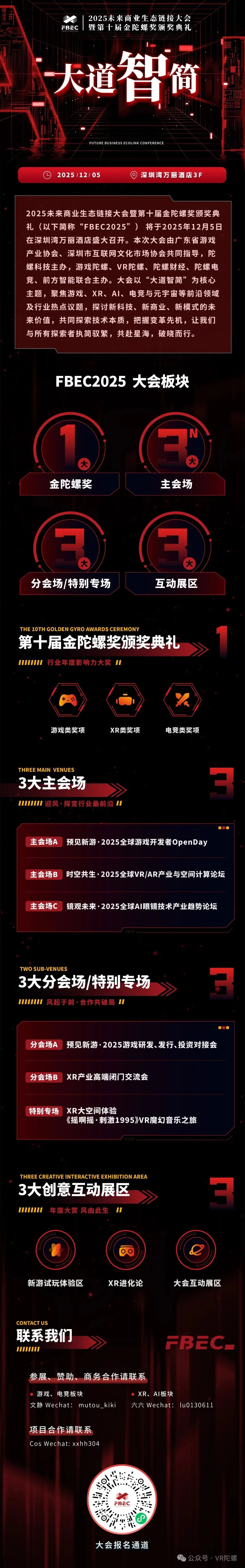 2025未来商业生态链接大会暨第十届金陀螺奖颁奖典礼(以下简称“FBEC2025”) 将于2025年12月5日在深圳湾万丽酒店盛大召开。本次大会由广东省游戏产业协会、深圳市互联网文化市场协会共同指导,陀螺科技主办,游戏陀螺、VR陀螺、陀螺财经、陀螺电竞、前方智能联合主办。大会以“大道智简”为核心主题,聚焦游戏、XR、AI、电竞等前沿领域及行业热点议题,探讨新科技、新商业、新模式的未来价值共同探索技术本质,把握变革先机,让我们与所有探索者执简驭繁,共赴星海,破晓而行!
