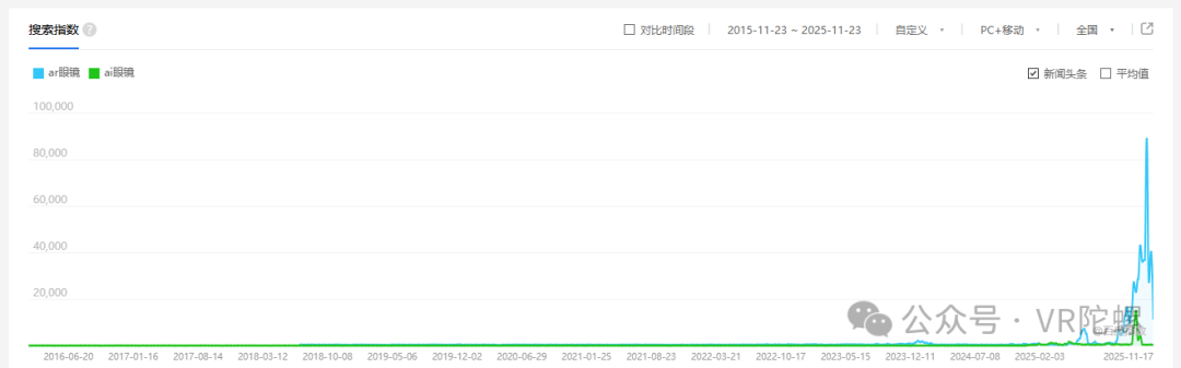 下图是关于“AR眼镜”与“AI眼镜”的百度指数,时间期限刚好十年。以往年份的搜索热度几乎与横轴重叠,然而就在2025年这短短一年内,两个词条指数均出现了明显飙升。