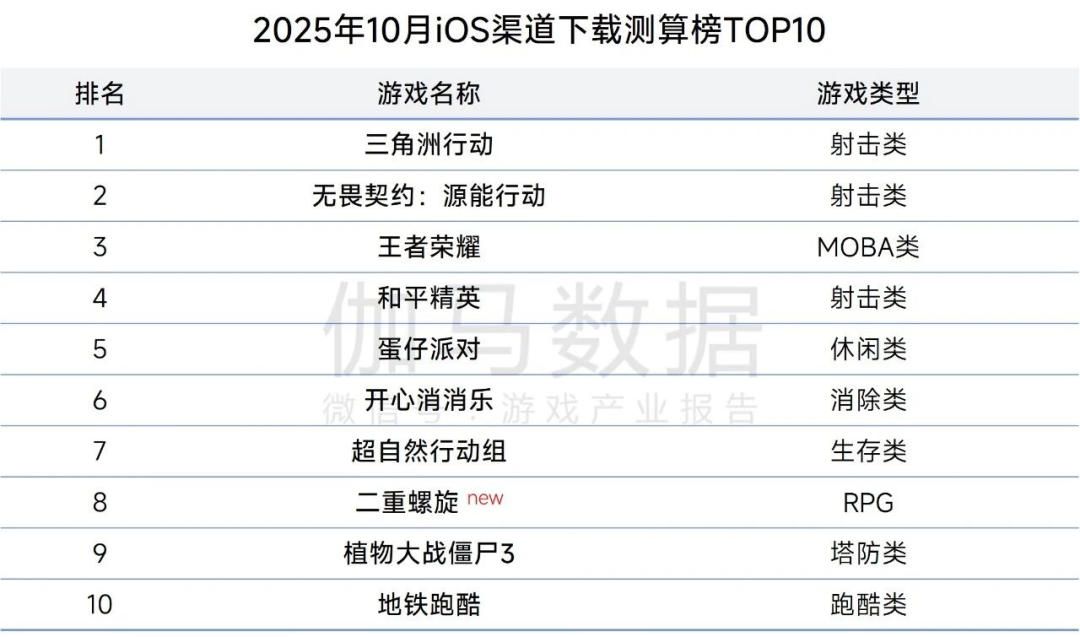 而在10月的iOS渠道下载测算榜中,射击类产品表现突出,《三角洲行动》登顶iOS下载榜,《无畏契约:源能行动》《和平精英》分列第二、第四。新游《二重螺旋》凭借“多维武器组合×立体战斗”玩法,连续4天位居App Store免费榜榜首。