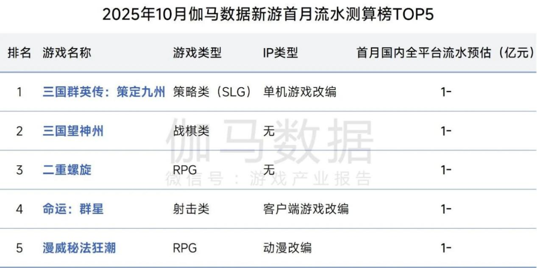 新游方面,10月份月流水榜单中,有两款三国题材产品《三国群英传:策定九州》与《三国望神州》位列新游首月流水榜前二。五款上榜产品首月流水预估均未超过1亿元,反映新游市场竞争激烈,突破难度较大。