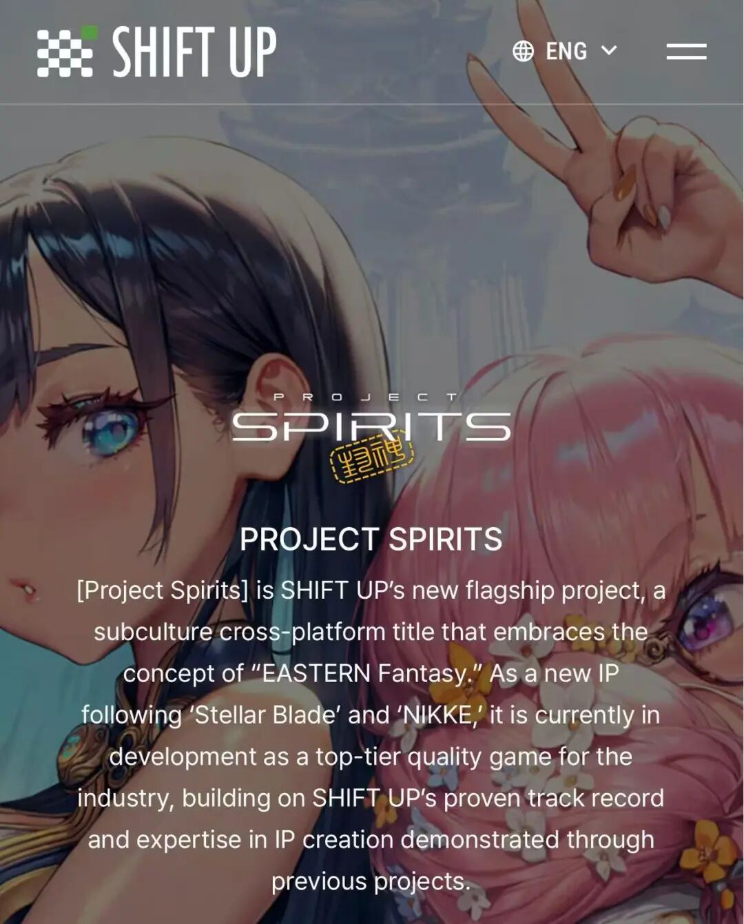 SHIFT UP官网此前曾透露,《Project Spirits》定位为一款全新IP的旗舰跨平台游戏,以“东方幻想”为核心主题,将基于SHIFT UP在以往项目中已验证的IP创造实力与专业技术打造。