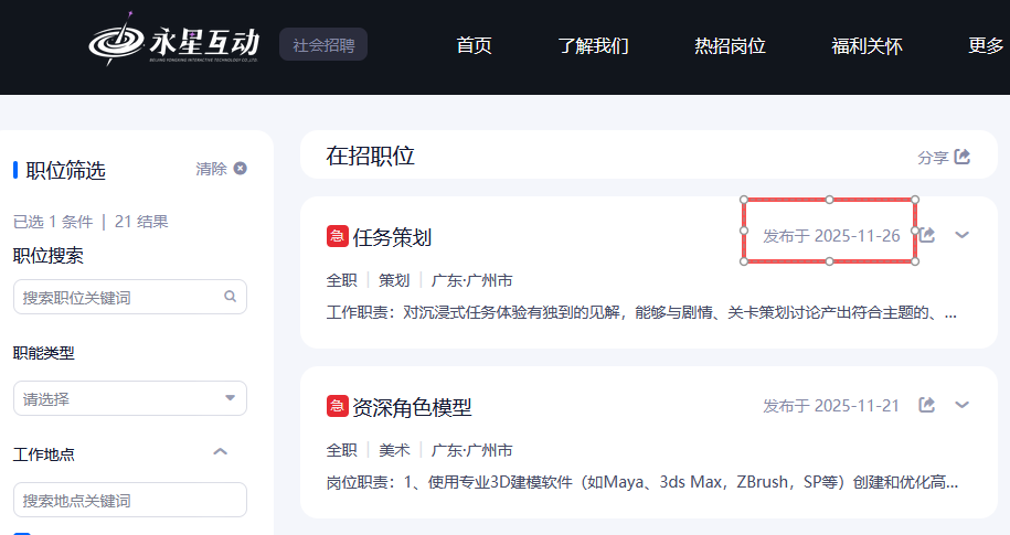 在永星互动官网也能看到,公司的广州所在团队已经开启了一轮新的招聘,涵盖任务策划、自身角色模型等岗位。