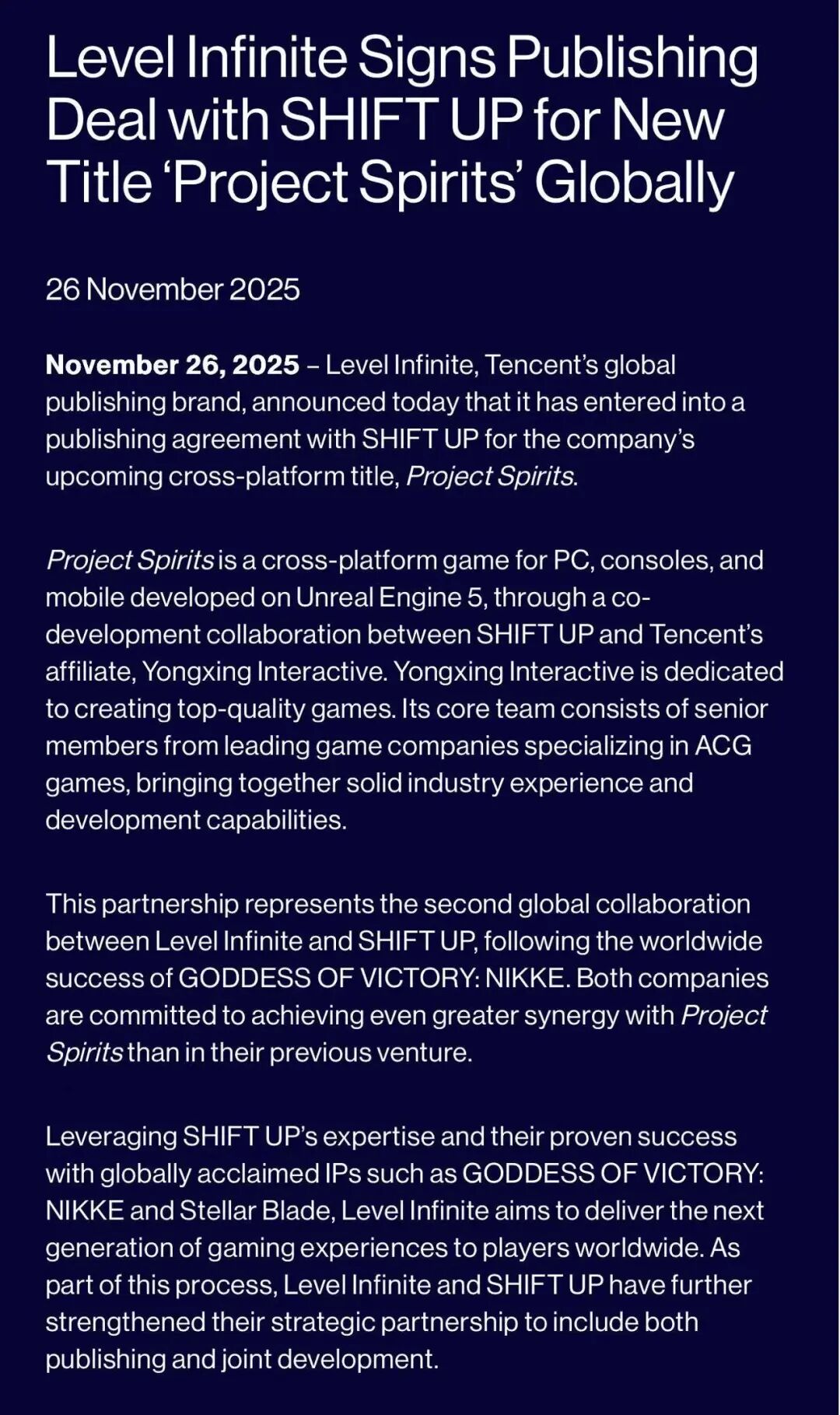 Level Infinite指出,此次合作是与SHIFT UP继《Nikke》之后的第二次全球性合作,两家公司致力于用该项目为全球玩家带来次世代的游戏体验。为此,Level Infinite与SHIFT UP已进一步强化了双方的战略合作伙伴关系,将涵盖发行与联合开发。