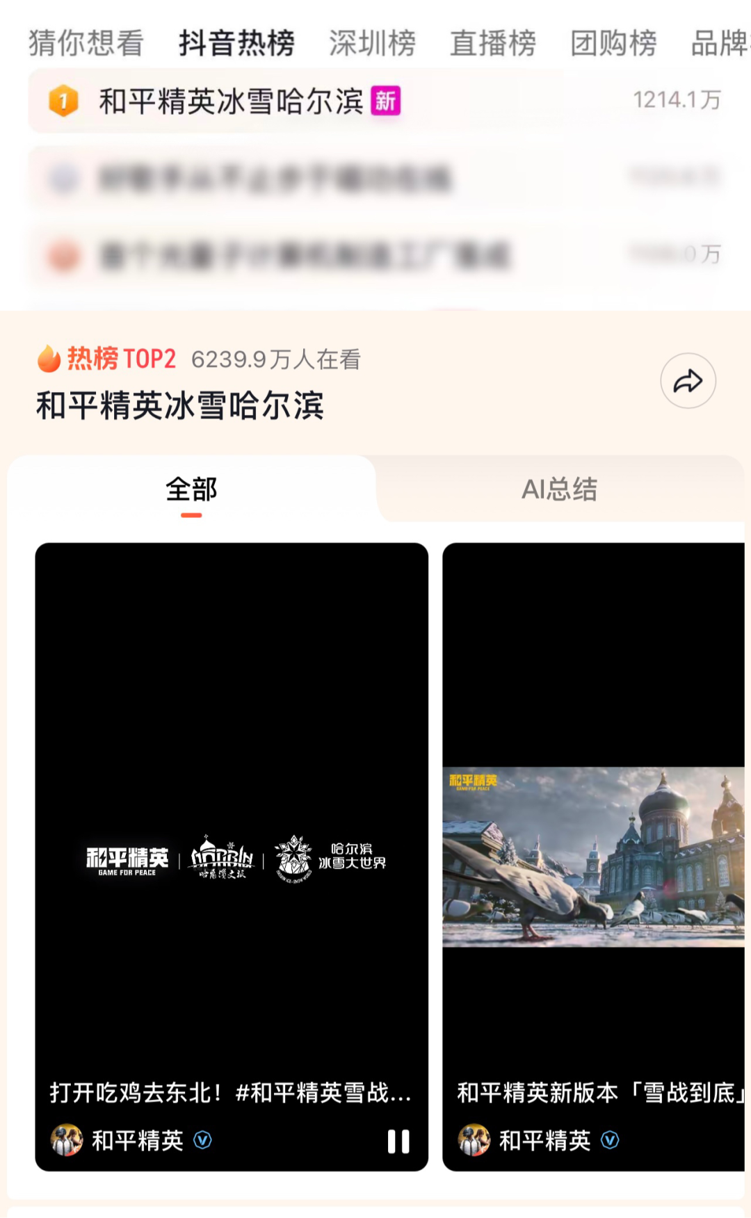 11月25日版本正式上线后,相关词条很快占据各大平台热榜。“和平精英冰雪哈尔滨”话题直接冲上抖音热榜第一,单一话题播放量迅速突破1亿,在线观看峰值更是超过6200万。