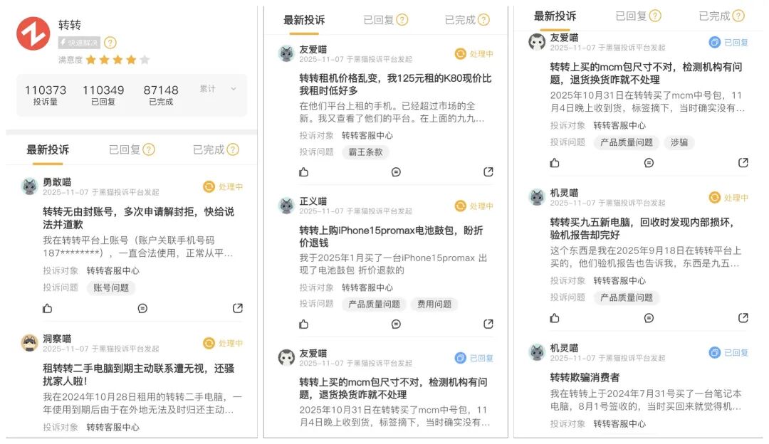 平台不是做公益。在深受转转广告狂轰滥炸的用户心中,转转是无数短视频中的“金主”,尽管在广告中一直传递靠谱形象,但在黑猫投诉平台上超11万条的投诉,以及诸如“阴阳检测报告”等负面事件,都在消耗着用户的信任。