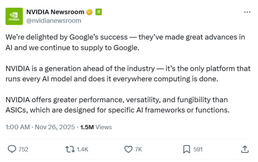面对Ironwood的挑战,英伟达在紧急声明中强调自己[能运行所有AI模型],但这恰恰暴露了其在专用场景效率上的劣势。