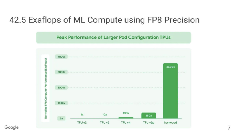 谷歌真正的杀手锏是集群扩展能力,Ironwood支持最多9216颗液冷芯片组成集群,总算力高达42.5 ExaFLOPS。