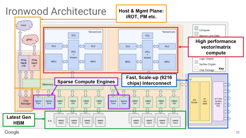 Ironwood的单芯片硬实力足以跻身全球顶级梯队,FP8精度下峰值算力达4614 TFLOPS,略高于英伟达B200的4500 TFLOPS。