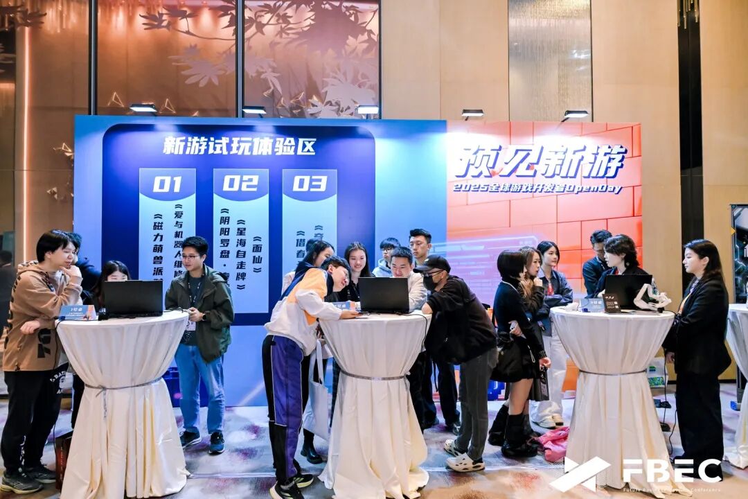 FBEC2025大会主题展区由“新游试玩体验区”、“XR进化论”及互动展区共同构成。现场人流如织,气氛热烈。其中:“新游试玩体验区”准备了7款新游供来宾畅玩;而“XR进化论”展区集中展示了20款年度新品,参会者通过沉浸式体验,直观感受XR技术为现实带来的变革与可能。