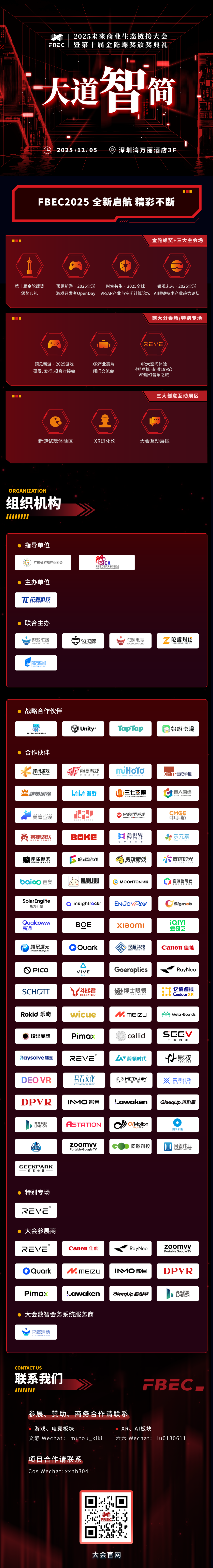 本届大会以“大道智简”为主题,聚焦游戏、XR、AI、电竞等前沿领域及行业热点议题,倾力打造三大主会场:「预见新游·2025全球游戏开发者OpenDay」、「时空共生·2025全球VR/AR产业与空间计算论坛」、「镜观未来·2025全球AI眼镜技术产业趋势论坛」;两大分会场/特别专场:「预见新游·2025游戏研发、发行、投资对接会」、「XR产业高端闭门交流会」、「《摇啊摇·刺激1995》VR魔幻音乐之旅」;三大互动展区:「新游试玩体验区」、「XR进化论」和「大会互动展区」等精彩内容。