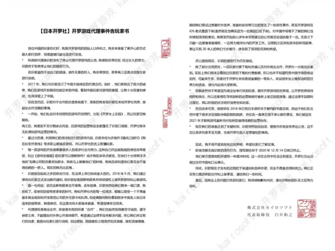 早在2021年10月,开罗社发布告玩家书,公开表示早在2018年便已与原中国发行商识君互娱解除合作。但识君互娱却迟至2021年才宣布将结束相关产品的运营,并在2017年起出现多项违约与侵权行为。