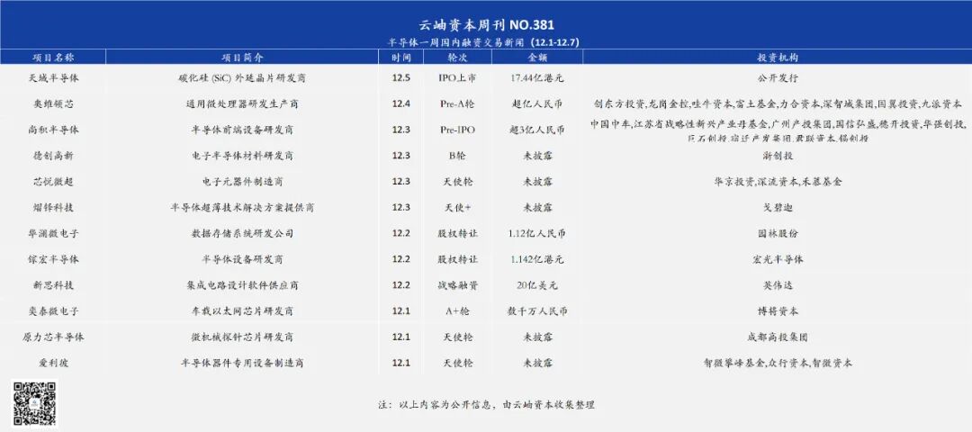 周刊丨半导体行业投融周动态(12.01—12.07)