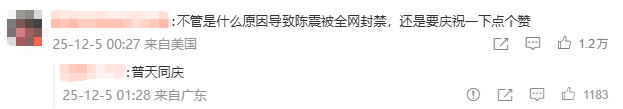 而陈震全网社媒账号被封后,有不少网友前往其微博下留言“庆祝”。