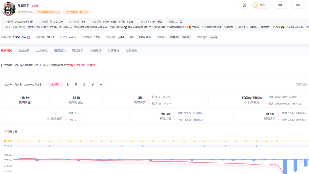 据灰豚数据,“陈震同学”抖音号12月5日掉粉达7.3万人,12月6日和7日,分别掉粉3万和1.8万。据此计算,仅仅三天,陈震掉粉即达12.1万。