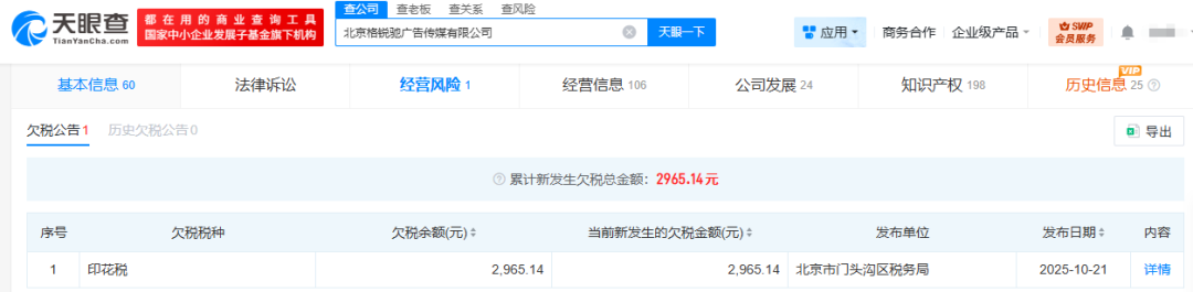 值得注意的是,目前,北京格锐驰广告传媒有限公司曾存在一条2965.14元的欠税记录,发布单位为北京市门头沟区税务局,欠税税种为印花税。