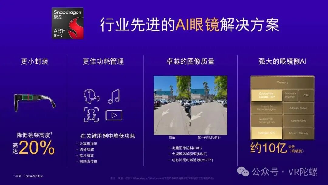 影像质量也是用户选择智能眼镜的重要考量。在AR1+ Gen 1平台上,我们通过持续优化图像防抖电子防抖EIS算法、多帧降噪方案,以及视频处理中的时域动态补偿算法,使眼镜的拍摄质量向旗舰手机的影像能力看齐。AI方面,凭借骁龙Hexagon NPU的强大能力加持,可在端侧运行1B级参数模型,为广大用户提供更丰富的差异化AI体验。