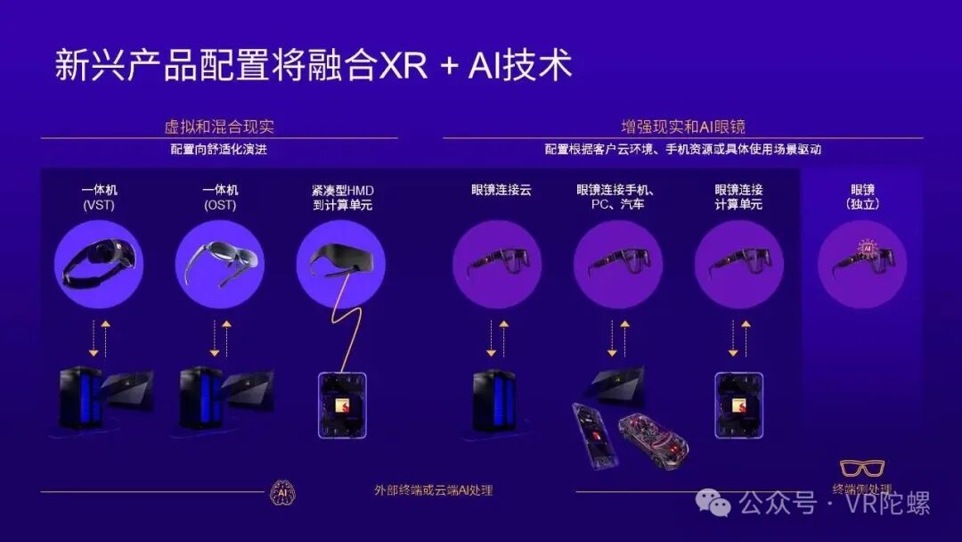 随着AI的深入发展,XR产品形态也在发生变化。早期VR/AR领域以一体机设备为主流,无论是MR一体机还是AR一体机。而未来我们将看到更轻薄的头显配合强大算力终端,或结合云端计算的组合形式。整体设备形态将朝着更小型化、更舒适化的方向发展。在增强现实与AI眼镜方向,眼镜设备可与PC、智能手机及车辆连接,计算方式也可根据应用场景在本地端或云端灵活部署。