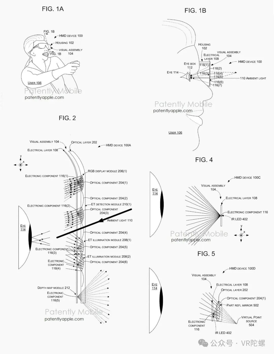 该专利进一步详细介绍了先进的光学技术,包括部分反射的“热镜”,它可以将红外光反射回眼睛,从而创建虚拟点光源以实现更精确的追踪。深度感知可以通过飞行时间和结构光照明方法实现,红外LED阵列和探测器协同工作,绘制用户前方环境的地图。重要的是,该设计允许环境光穿过,确保即使在投影虚拟内容时,现实世界的视觉效果仍然清晰。