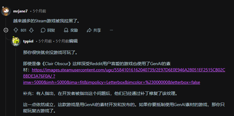 有玩家表示自己已经拉黑了不少AI游戏,有玩家则回复道,想要不玩到生成式AI素材的游戏,只能玩老游戏了。