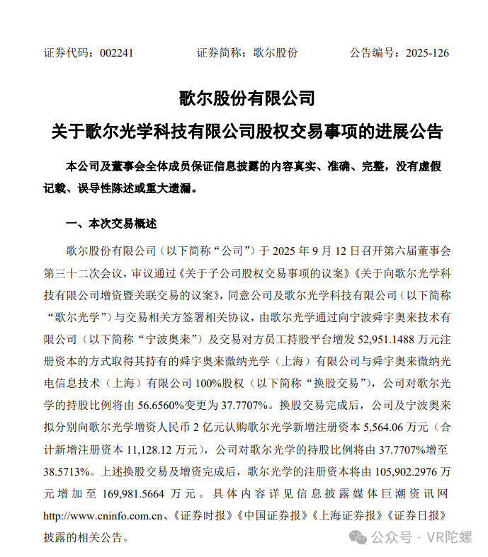 近日,歌尔股份发布了一份《关于歌尔光学科技有限公司股权交易事项的进展公告》。文件中提到,企业此前披露的转让附属公司全部股权以换取歌尔光学科技有限公司(简称“歌尔光学”)股权及进一步认购歌尔光学股权两项交易已正式完成。