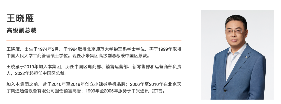 2019年加入小米集团后,王晓雁历任中国区电商部、销售运营部、新零售部和运营商部负责人,2022年起担任中国区总裁。