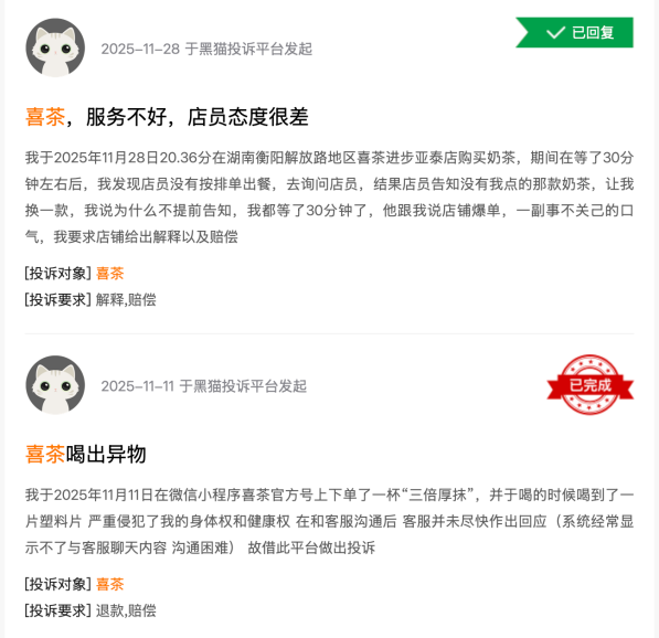 截至发稿,在黑猫投诉平台上,与喜茶相关的投诉超2200条,其中不乏服务态度差、喝出异物等问题。