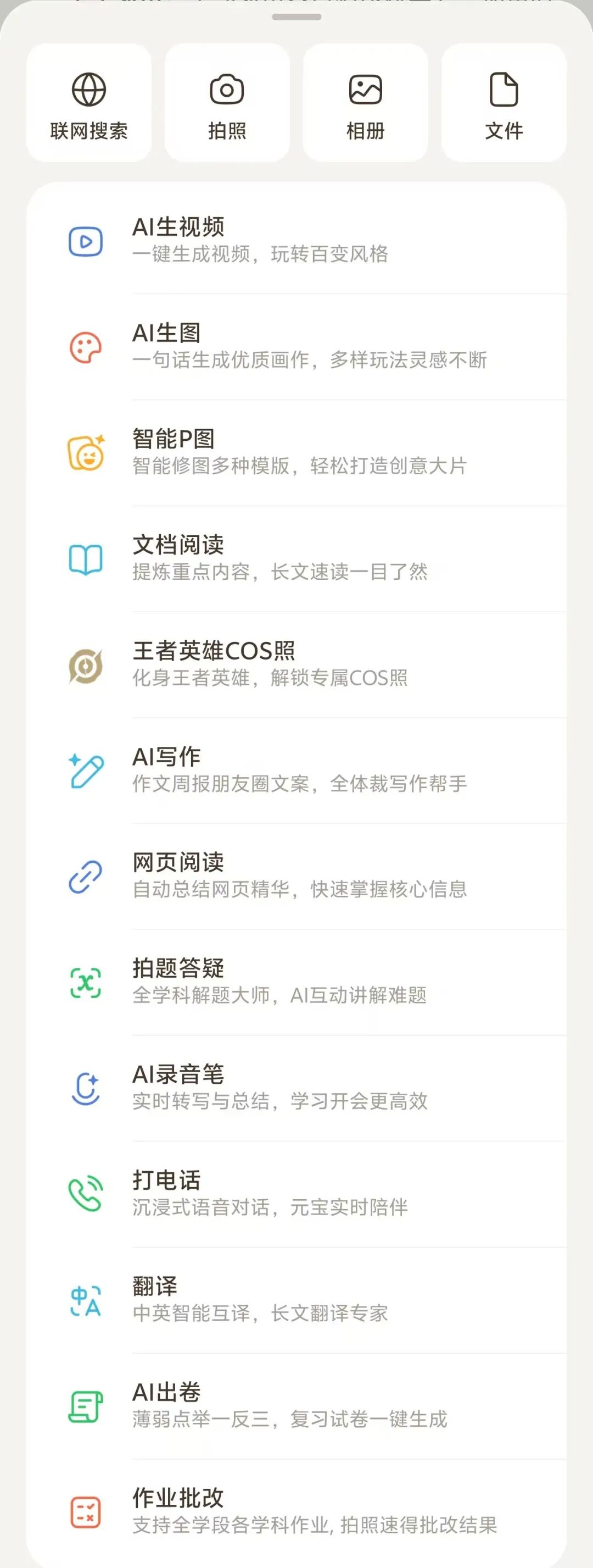 除了现在行业内热议的正在内测的“元宝派”功能之外,元宝App在整体产品的体验上都出现了较大优化,界面设计更加美观、简洁,功能也更加实用、好用。例如,其底部导航栏划分为“问元宝”、“派”、“创作”与“我们”四个版块,一目了然,与微信的呈现方式非常接近。尤其在“问元宝”的模块页面,其在文字/语音输入框的右侧设置了一个“+”按钮,点击“+”按钮,最上方的第一行分别是联网搜索、拍照、相册与文件四个横向排列的选择按钮,从第二行向下是依次排开的“AI生视频”、“AI生图”、“智能P图”、“文档阅读”、“AI写作”、“网页阅读”、“拍题答疑”、“AI录音笔”、“打电话”、“翻译”、“AI出卷”与“作业批改”等用户最常用的功能。