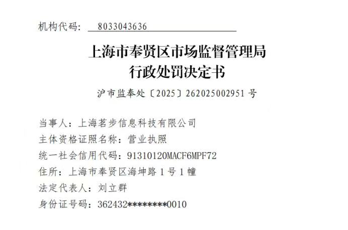天眼查显示,上海茗步成立于2023年,是一家以从事科技推广和应用服务业为主的企业,注册资本100万元,法定代表人为刘立群。行政处罚决定书还提及,上海茗步的注册地址位于上海市奉贤区,实际经营地址位于深圳市福田区。这种异地经营的模式,也为其规避日常监管提供了便利。