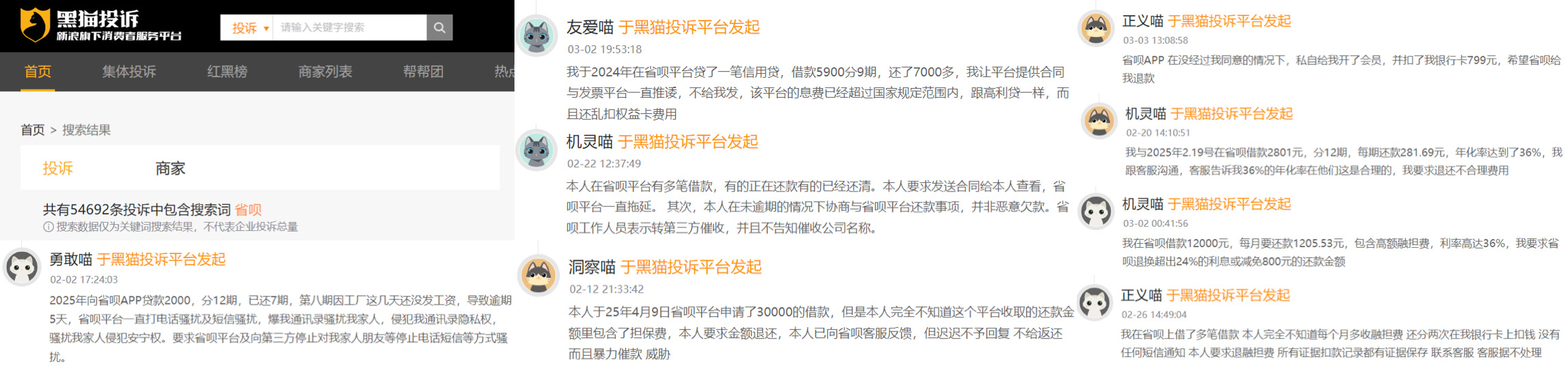 成立十年间,省呗通过规模扩张维持增长,但规模扩张的背后,是合规投入不足和风险累积,也为日后的争议爆发埋下了隐患。截至2026年3月16日,仅黑猫投诉平台与“省呗”相关的投诉就超5万条,核心问题集中在综合息费超标、暴力催收、强制搭售、信息不透明等方面。