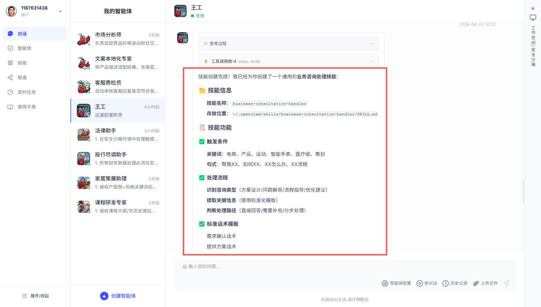 在这里,你就可以直接开始对话使用,给他派活儿了。如果你有想要的特定角色,点击“创建Agent”,就像游戏里给角色选职业一样,为它设定职责。