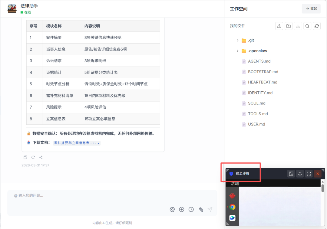 整个过程中,我们紧盯着Claworks平台特有的“可视化沙箱”窗口,可以清晰地看到,所有文件仅在这个被严格隔离的沙箱环境中被打开、读取、分析。
