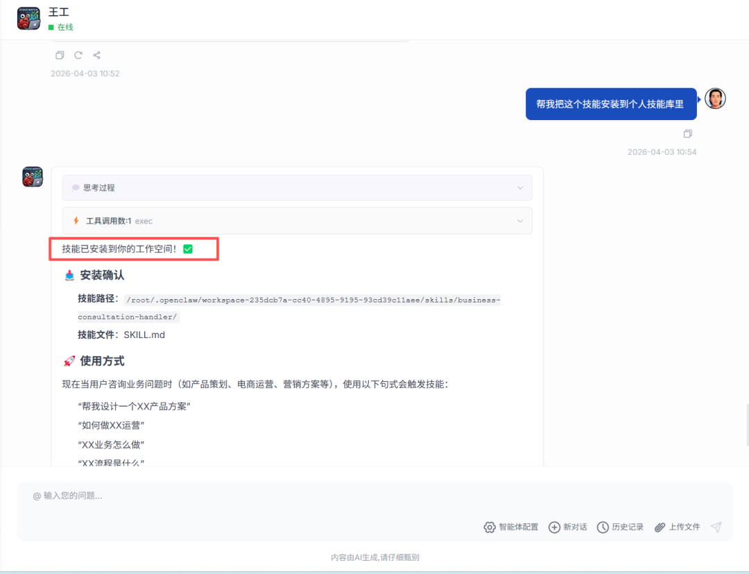 这个skill可以保存在你的私人技能库,也可以一键升级为“部门共享技能”!