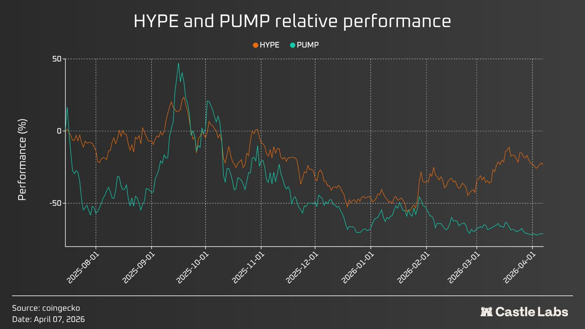 这说明,仅靠回购并不足以推动代币价值持续上升。其他因素同样关键,包括整体市场的回撤、代币释放计划与锁定期解锁、赛道叙事变化,以及协议整体市场情绪等。这些因素将在后续章节中进一步探讨。在此之前,我们先对比两个收入最高的协议及其代币表现:Pumpdotfun 与 Hyperliquid。从下图可明显看出,在两者均积极执行回购计划的期间,HYPE 表现更优(HYPE 的年化持有者收入约为 6.6 亿美元,PUMP 约为 3.8 亿美元),这主要得益于协议整体情绪更佳,以及市场对未来供应冲击与代币解锁的预期定价。