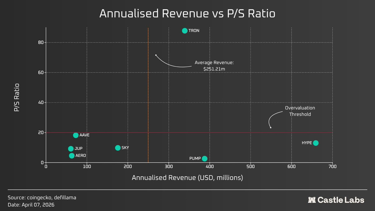 我们将估值过高的阈值设定为 20,参考的是美国顶级上市公司股票的 P/S 比率。大多数协议的 P/S 处于或低于该阈值,Tron 是例外,其交易比率远高于其他协议。另一个我们考虑的阈值是收入水平,取所讨论协议的平均年化收入,约为 2.5 亿美元。仅有 Pumpdotfun、Hyperliquid 和 Tron 三项协议超过此门槛,合计贡献了所列协议约 80% 的收入。