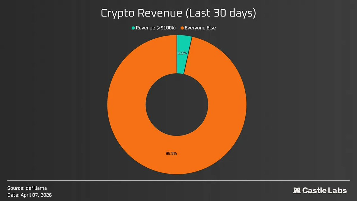 Coingecko 上列出了超过 17,000 种代币。DeFillama 上约有 5700 个协议;若我们仅统计过去 30 天内产生超过 10 万美元收入的协议,则仅有约 200 个协议或产品,占比仅为 3.5%。加密货币中真正可投资的池子,比任何人想象的都要小得多——绝大多数代币根本无法投资。