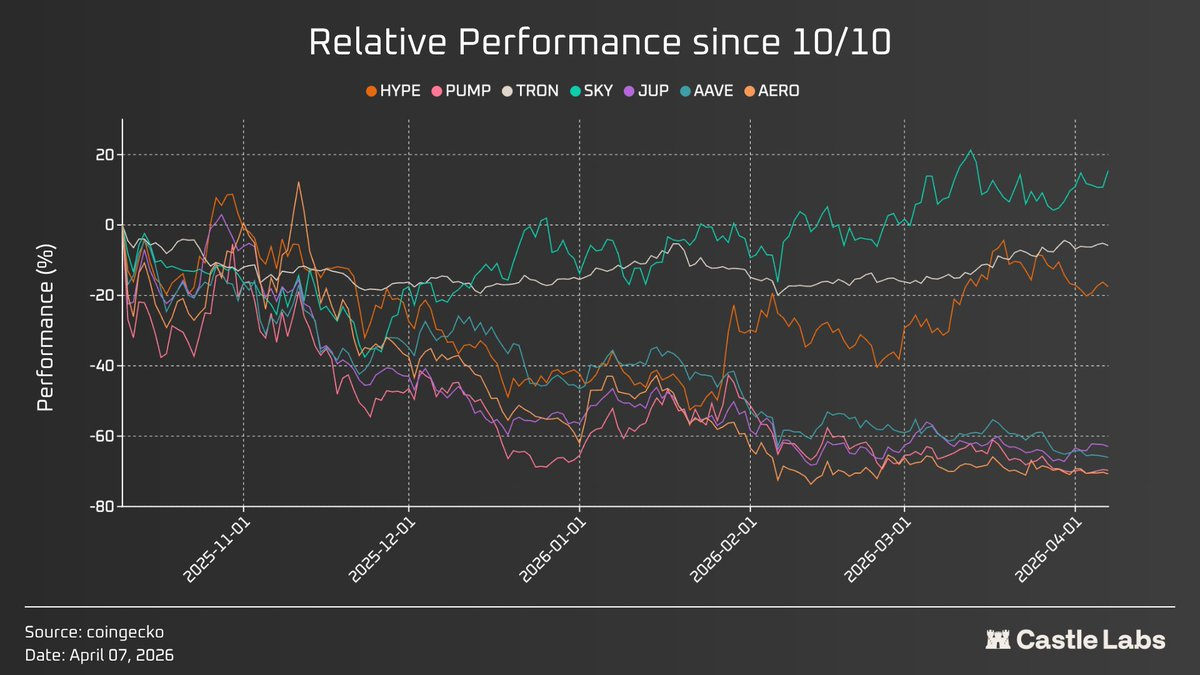 这只是图景的一面,表明回购正在持续执行,若维持当前节奏,将为代币价值增加数百万美元。为了更清晰地理解价值积累效果,我们还对比了这些代币自10 月清算事件以来的相对表现,以评估代币价值积累活动的实际影响。