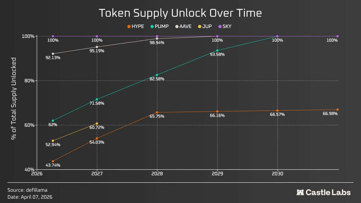 下图展示了若干固定供应代币的供应解锁速度。尽管大多数代币最终都会完全解锁,但其节奏差异显著:PUMP 的解锁速度最快,而 HYPE 最慢。通常而言,较慢的解锁安排更受青睐,因为它降低了突发性供应冲击及市场难以消化的抛压风险。对于 AAVE 和 SKY 等代币,大部分供应已解锁;而 JUP 的长期解锁计划则由 DAO 治理决定,属于非确定性释放。