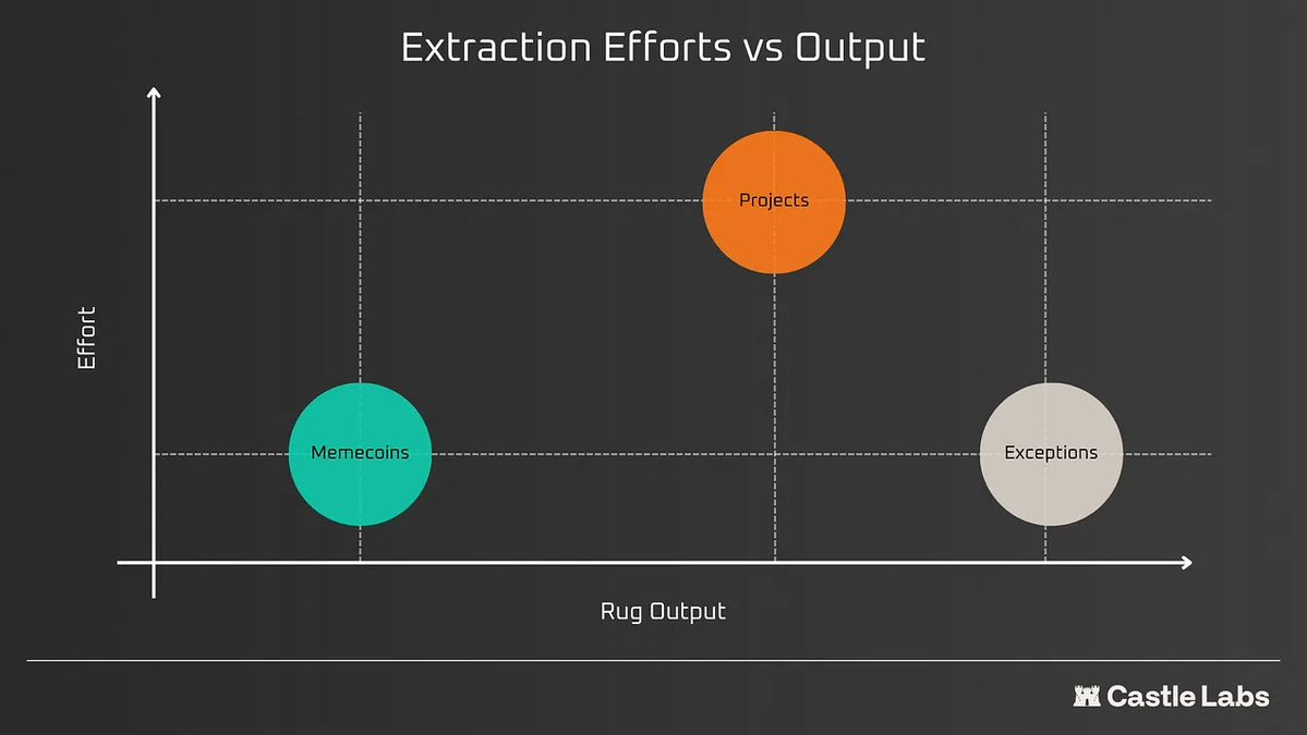 其中最简单的提取方式是 Meme 币,这类模式至今仍有效,未来也可能持续,但增速或将放缓。Meme 币易于发行,无需解释其用途或发行原因,因为盈利核心只有一条:在他人之前退出交易。参与 Meme 币交易者通常清楚这一点,某些情况下亏损也是市场运行的自然结果。另一类则是过度承诺、大肆炒作后缓慢「跑路」的项目。此外还有少数例外,即低投入却能最大化提取价值的项目,例如名人币。